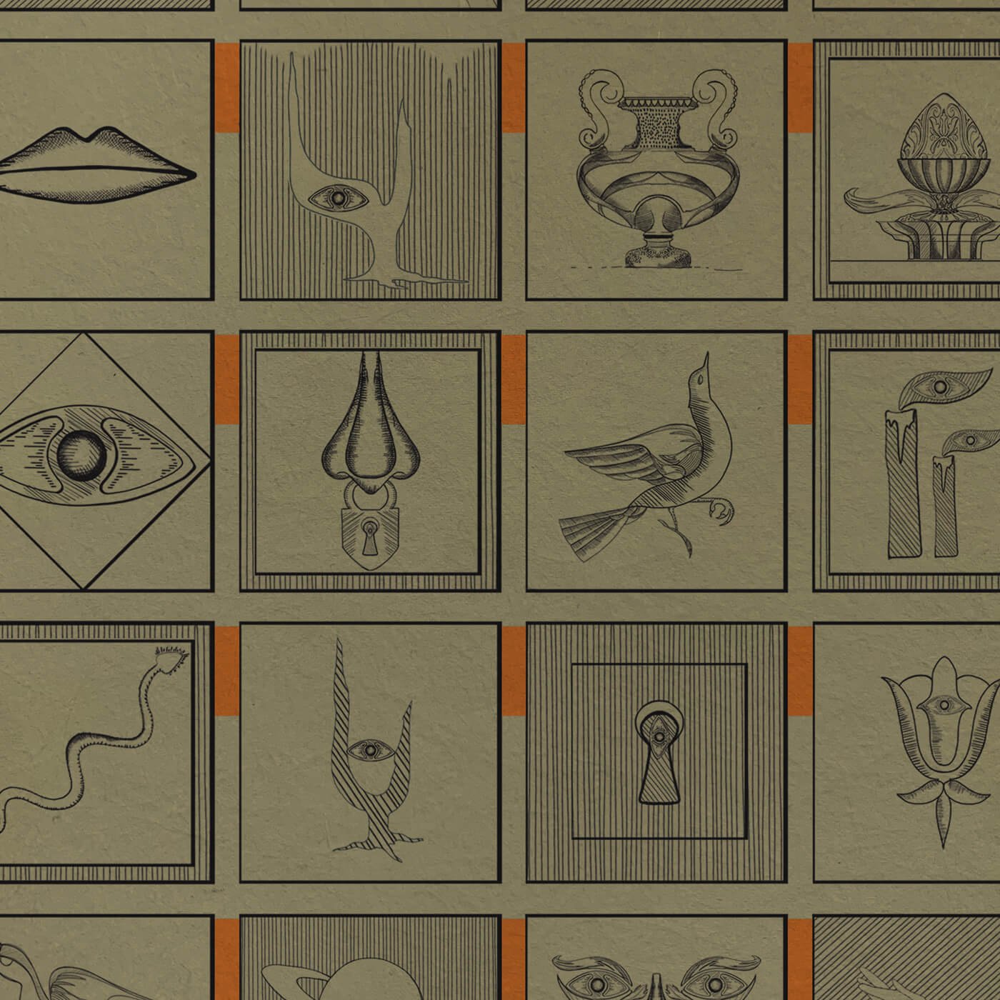 The pattern arises from a free composition, but presents itself as an orderly modular grid, structured yet fluid — like an archive of visual archetypes. Each element stands alone yet speaks to the whole, forming a fragmented, mysterious narrative, like pages from a lost alphabet.