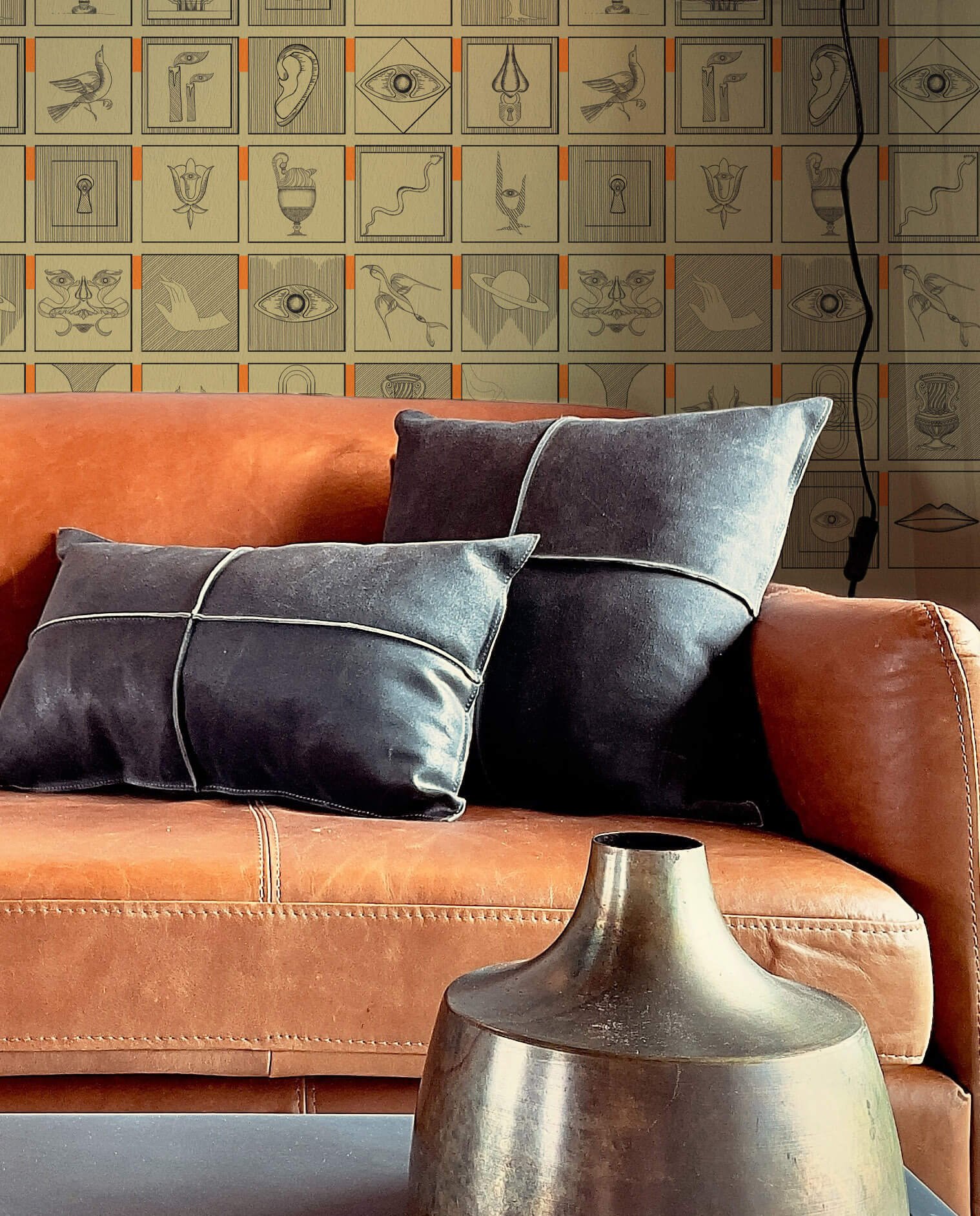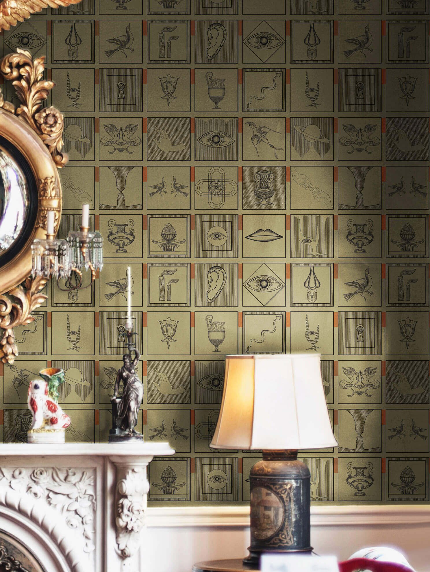 The Alchemici wallpaper, leading actor in a visual play of transformation and illusion, owes its expressive power to meticulous ink drawings, carefully digitized to create a modular graphic composition that resists predictability.
