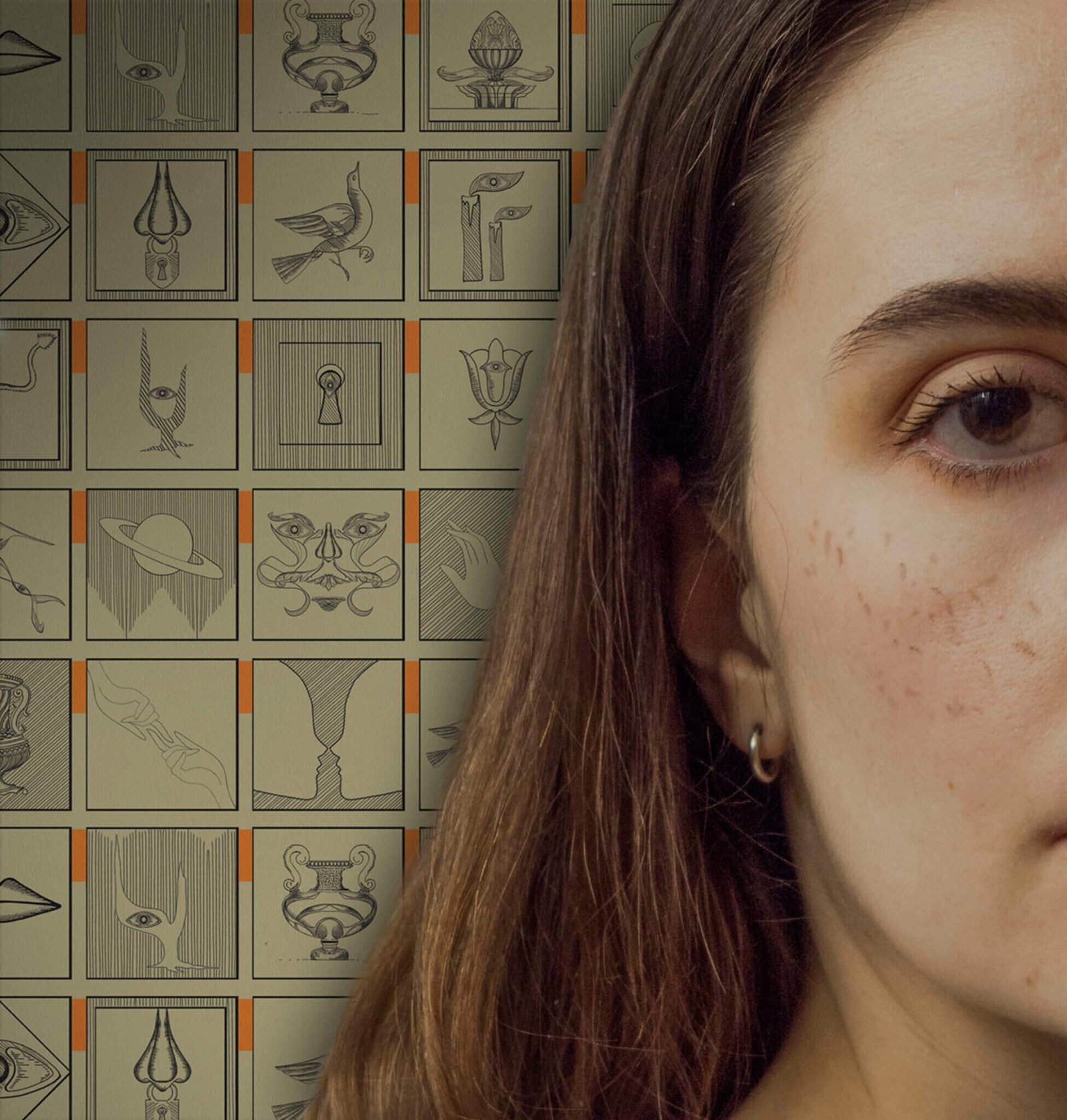 Like a visual kaleidoscope, reflections, symmetries, and ambiguities generate forms that constantly shift meaning and direction. Each square is an enigma: human profiles that touch and vanish, keys and locks, suspended mouths, serpents and flames, eyes that observe as metaphysical presences.