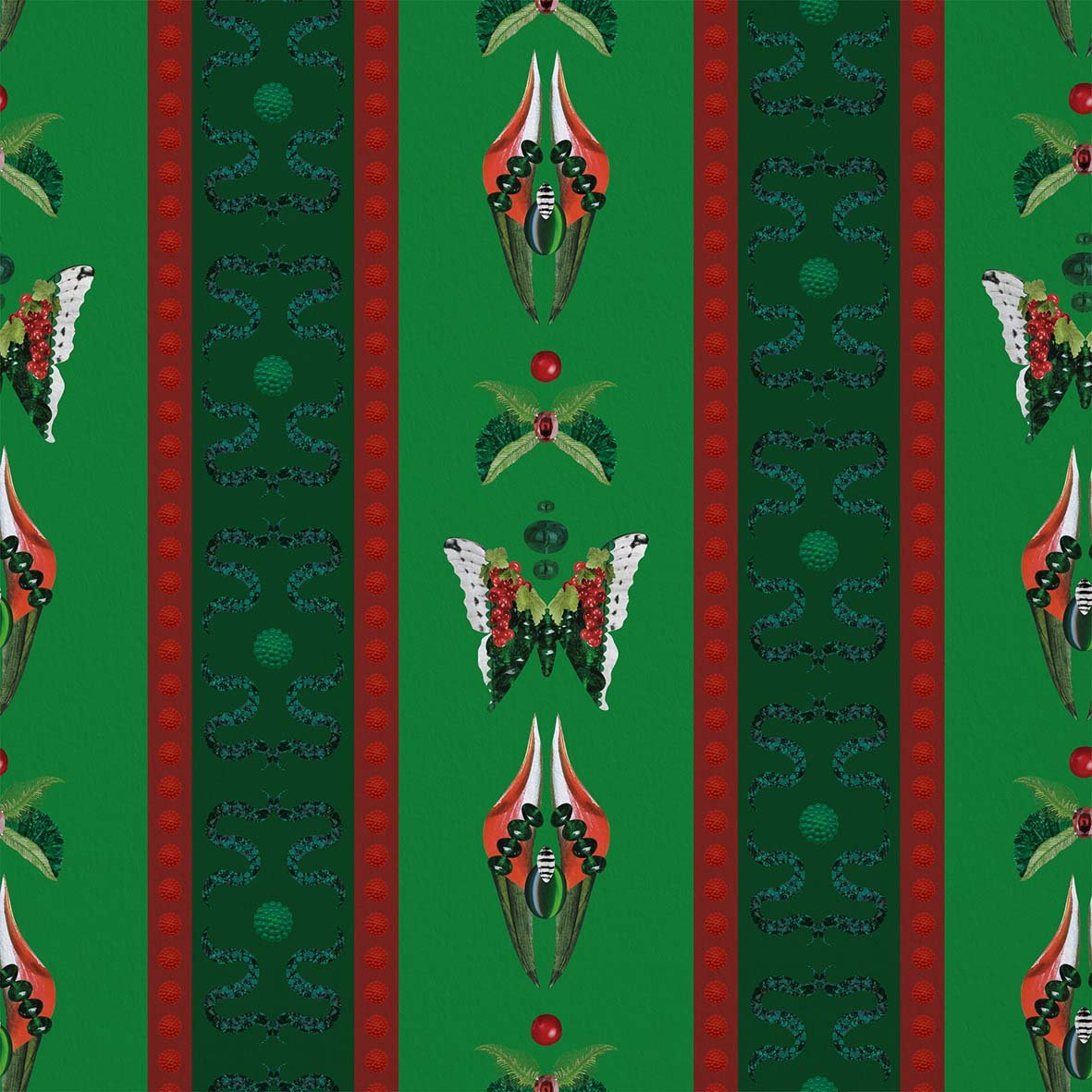 Bugs Lines Jade draws inspiration from ancient symbolism and baroque opulence, reimagined through the contemporary sensibility of a narrative, graphic, and highly expressive design.