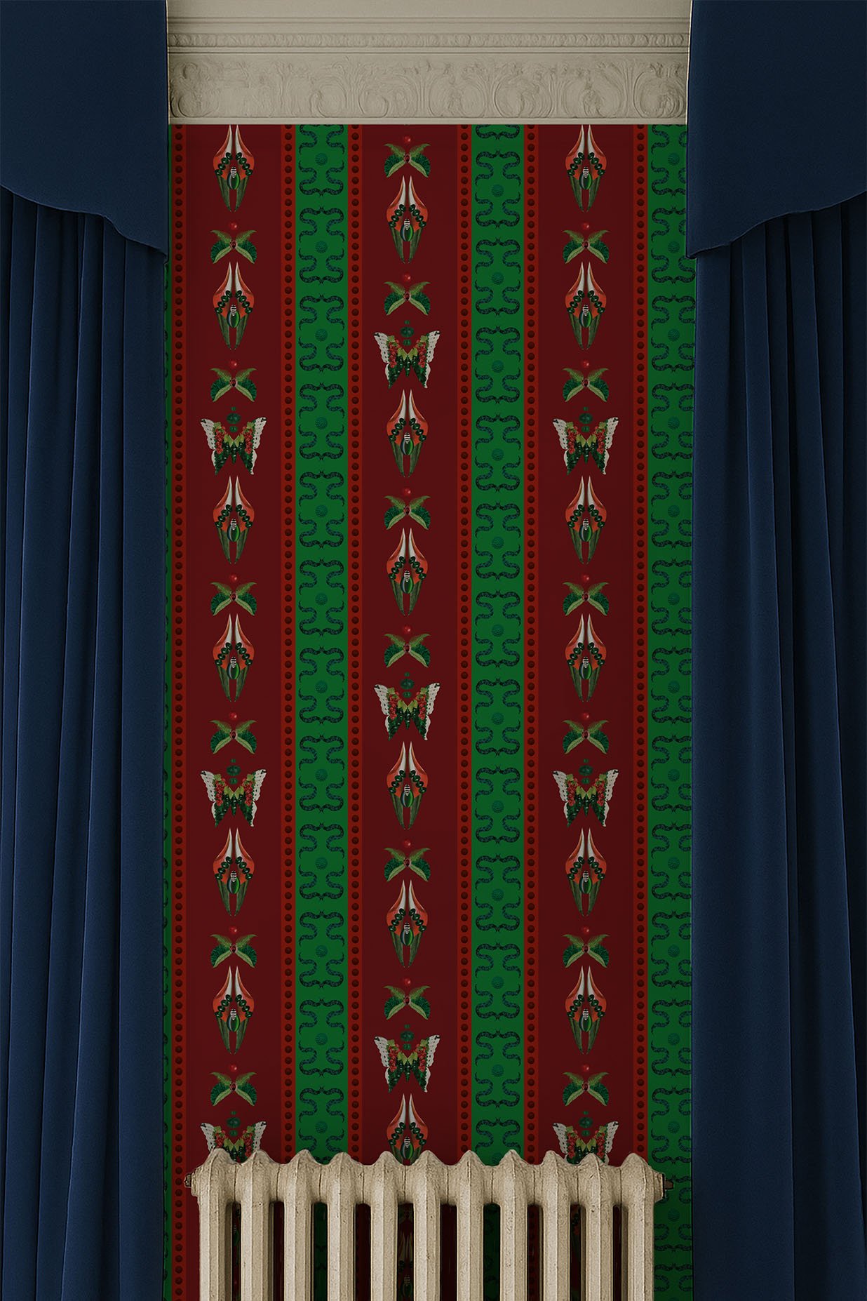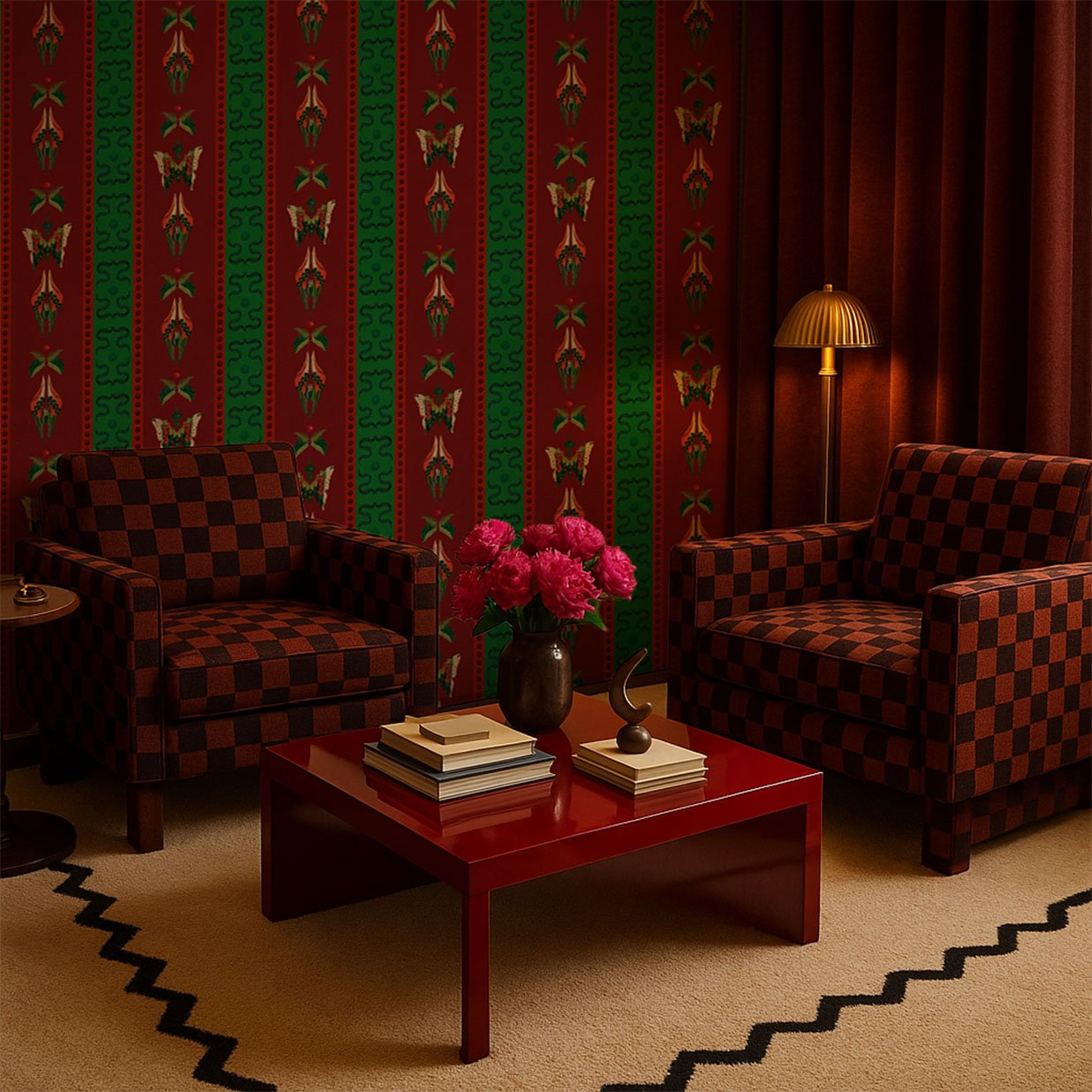 The Bugs Lines Ruby variant ignites the pattern with a striking chromatic combination: an enveloping ruby-red background, sensual and deep like velvet or wine, overlaid with emerald-green ornamental bands that guide the rhythmic and chromatic flow.
