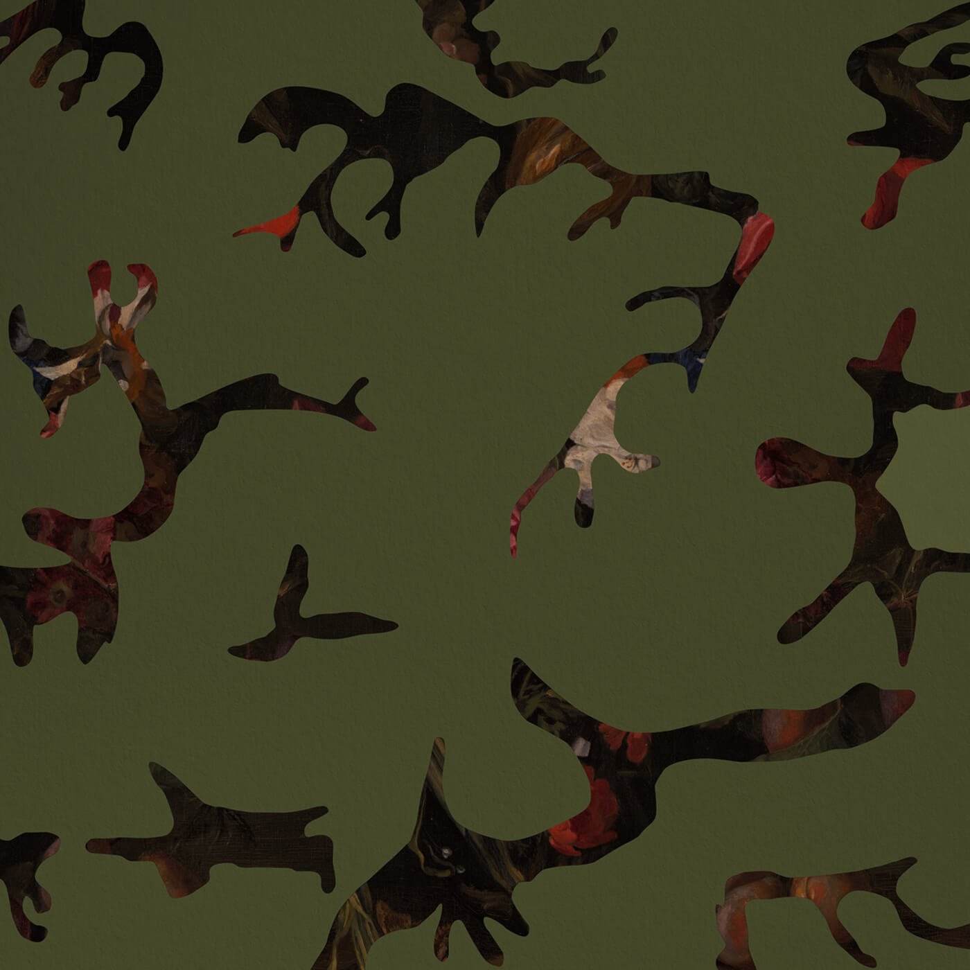 The Find Me In The Dark design by Magnus Gjoen is a wallpaper that fuses camouflage, engraving, and classical painting into a visually rich and conceptually powerful pattern.