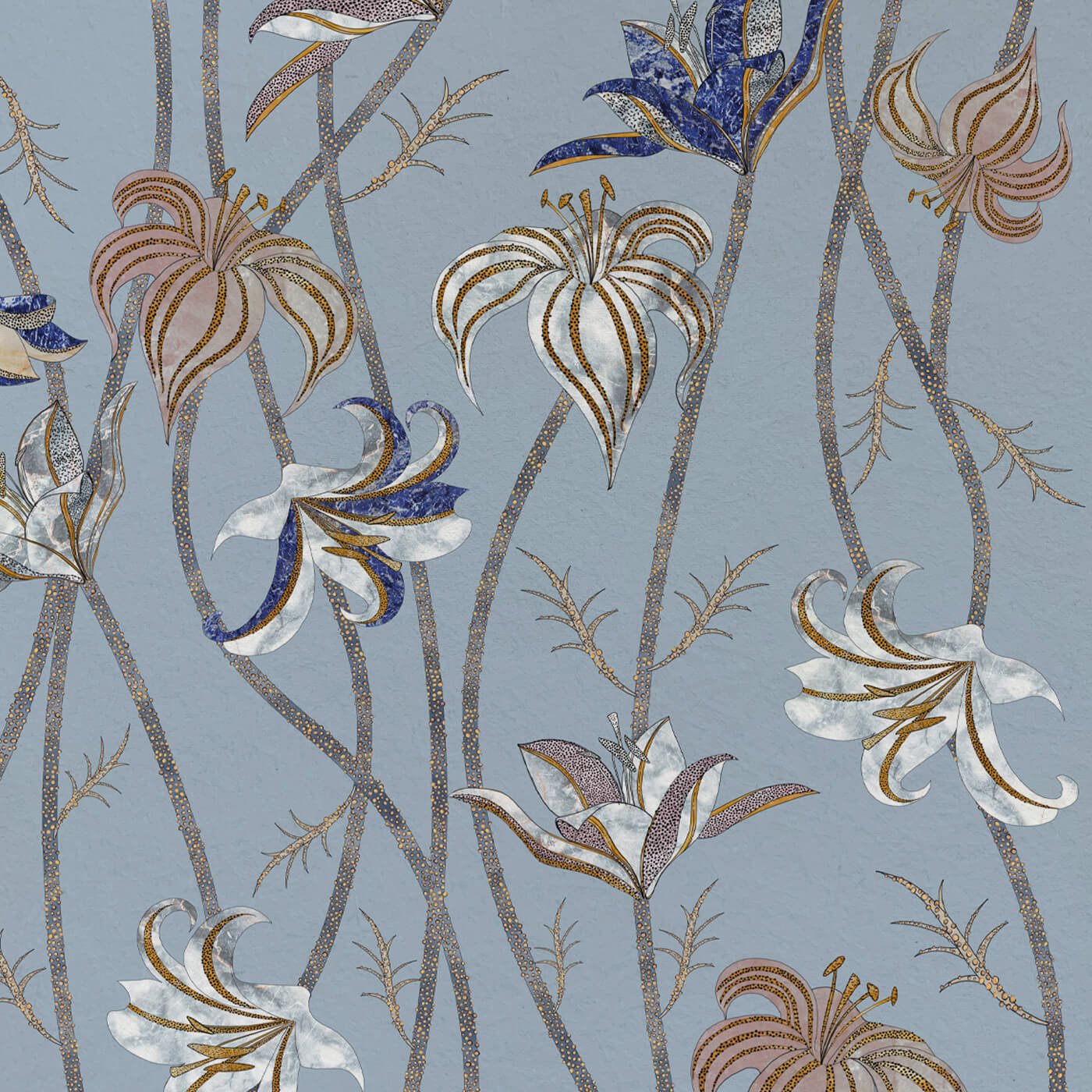 In this version, the background takes on a soft cornflower blue tone, desaturated with moon-grey undertones — a mineral hue, perfect for accompanying the design and highlighting the gold, blue, and ivory nuances of the flowers.