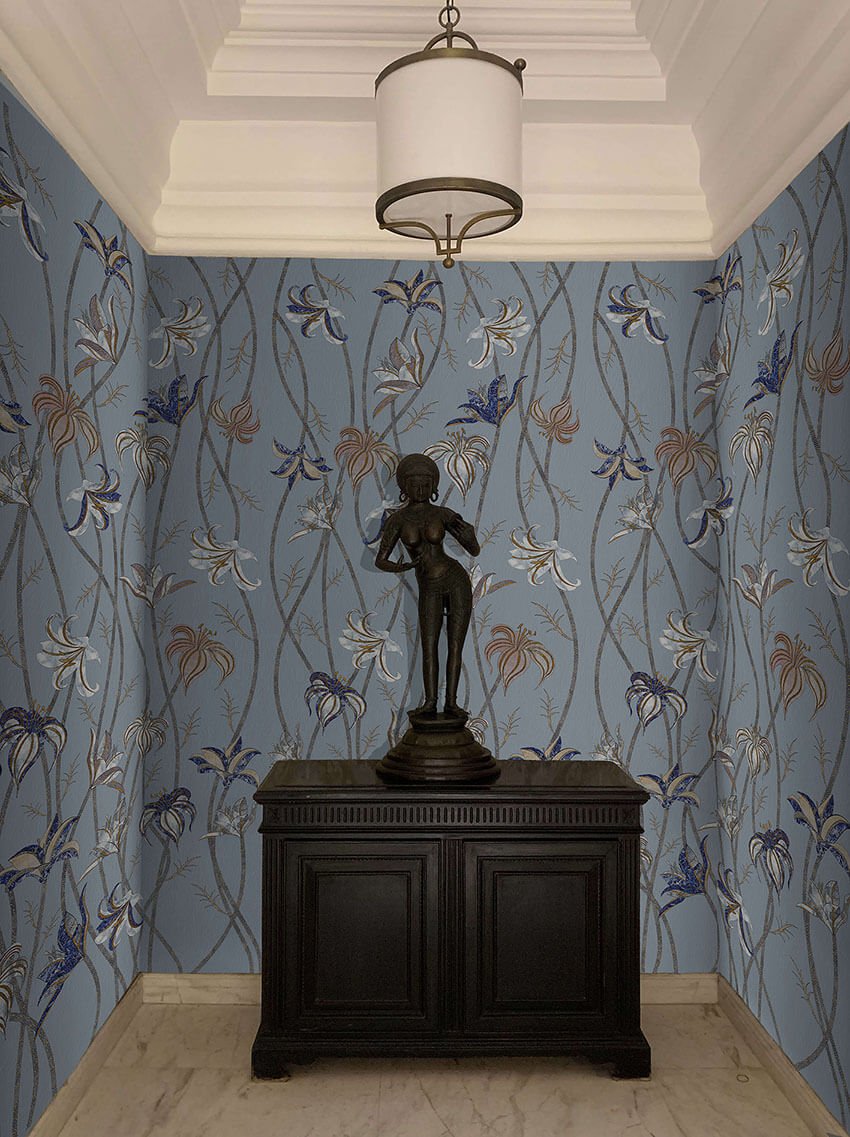 Rich in detail yet imbued with lightness, the pattern lends itself to narrative walls, bedrooms, contemplative corridors, and spaces of quiet reflection.