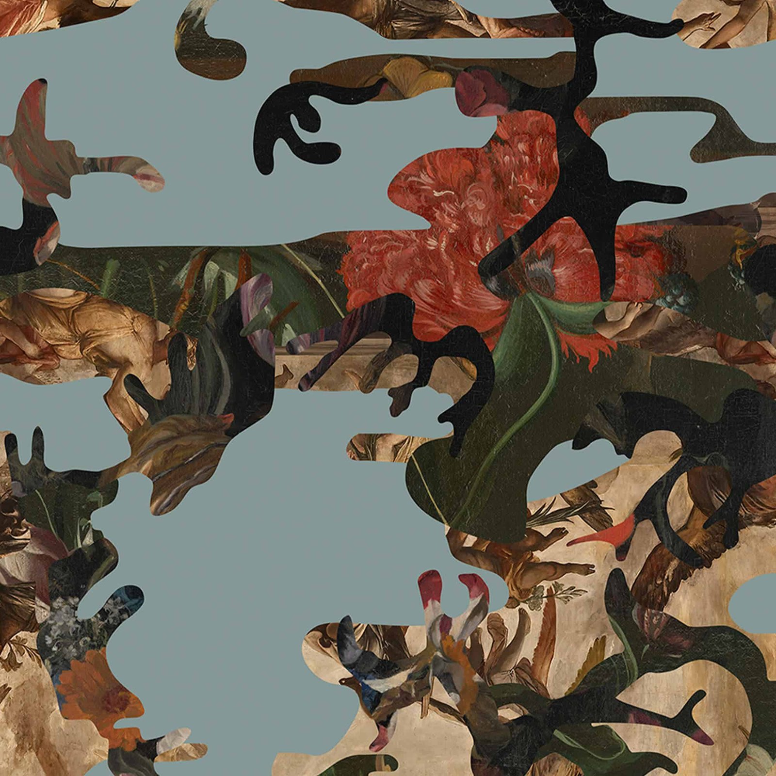 The result is a layered, narrative wallpaper, where the gaze is continuously invited to recognize, search, and read between fullness and void.