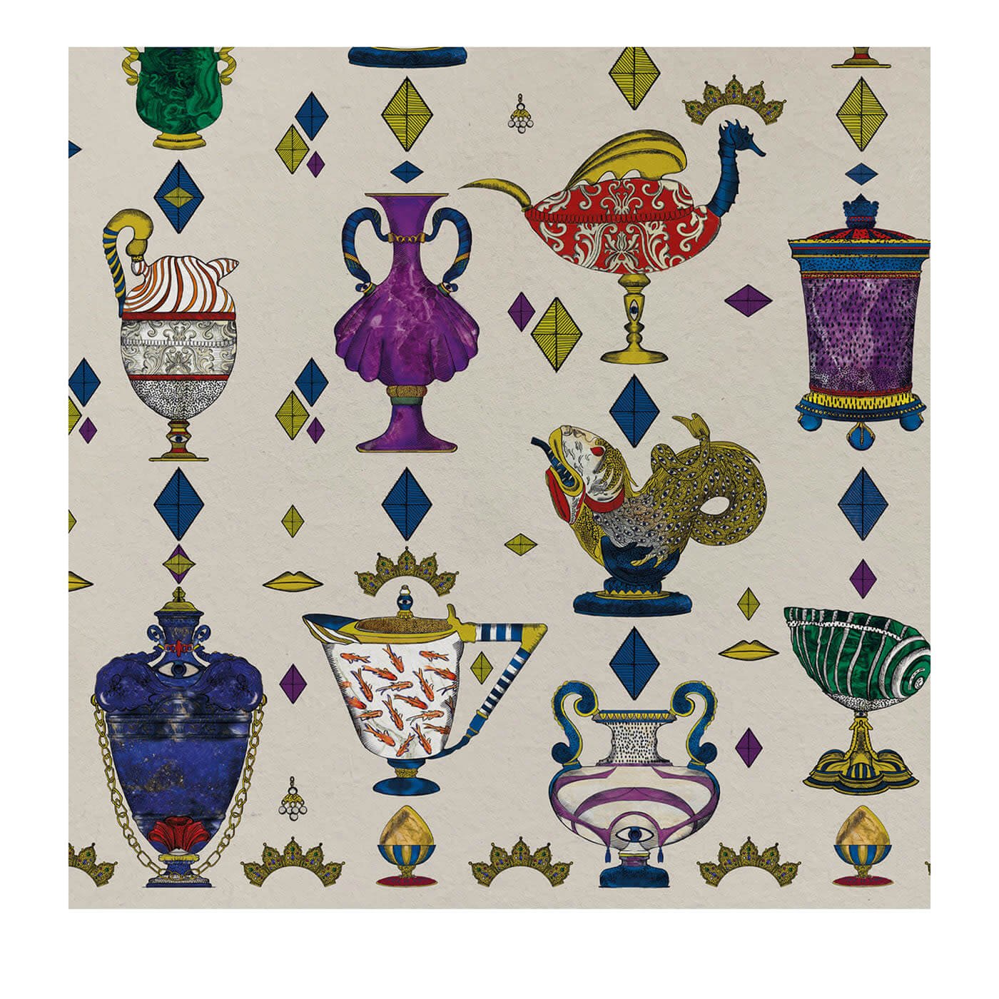 Ludovica presents itself as an imaginary visual archive: urns, chalices, cups, heraldic animals, and Wunderkammer relics emerge across an open field, each bearing its own symbolic significance.