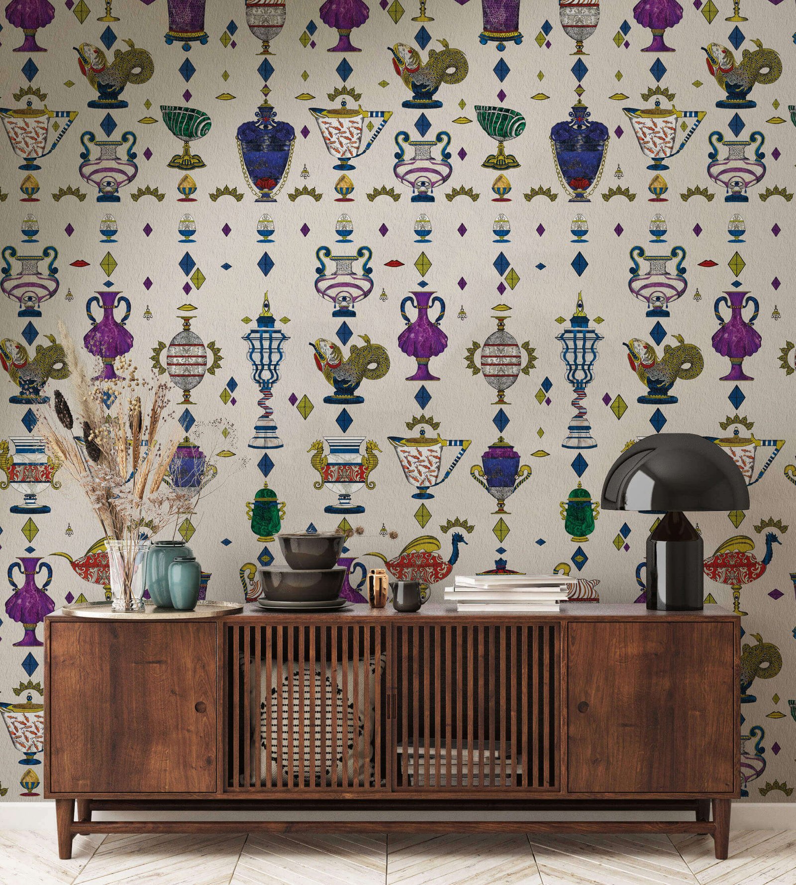 The result is a luminous, noble, and rarefied wallpaper, perfect for bright, classic, or contemporary interiors seeking a balance between ornament and visual clarity.