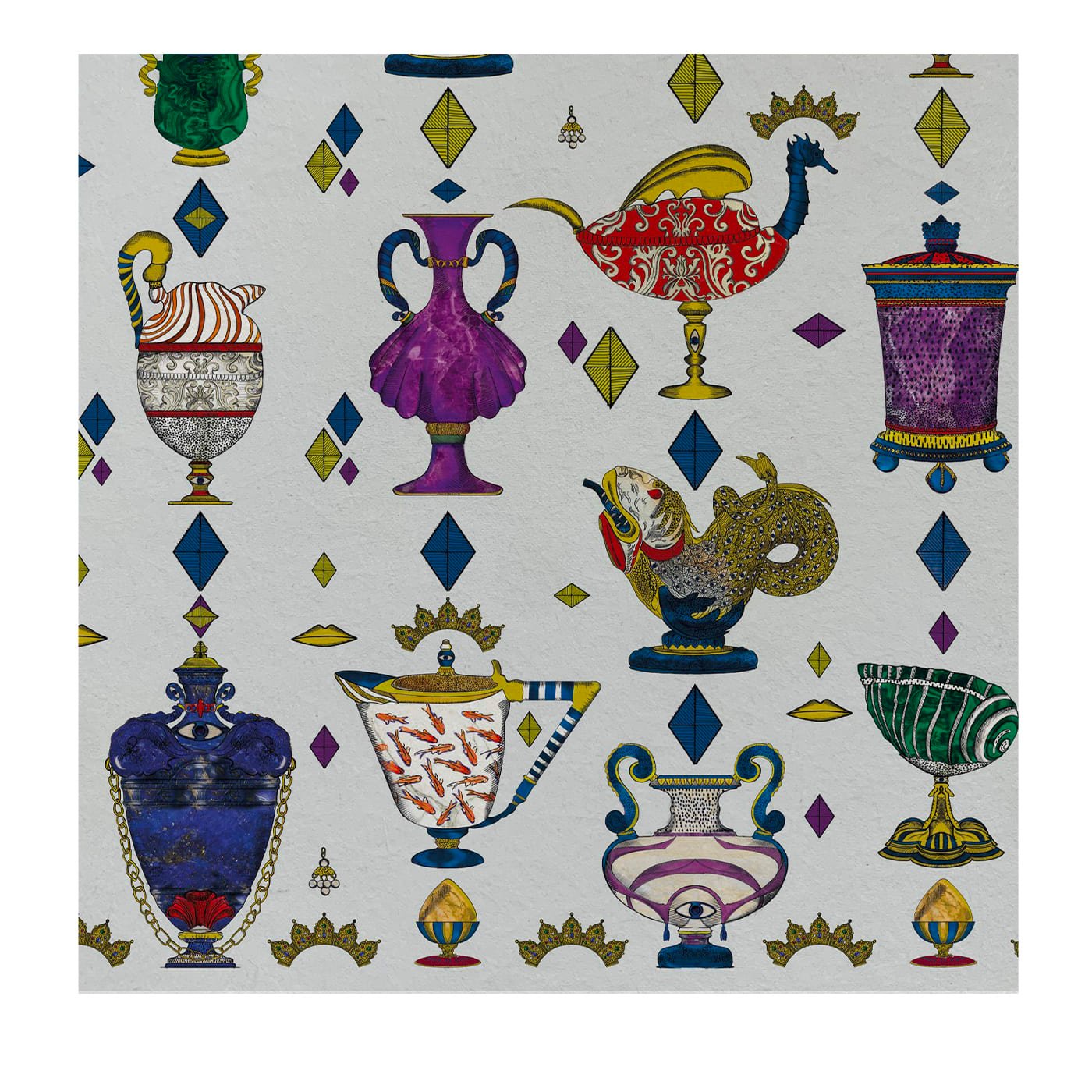 The Ludovica design stages an imaginary inventory of precious objects: urns, chalices, fantastic creatures, jugs, heraldic symbols, and decorated vases alternate like rare pieces in a private museum, transforming the wall into a collector’s space.
