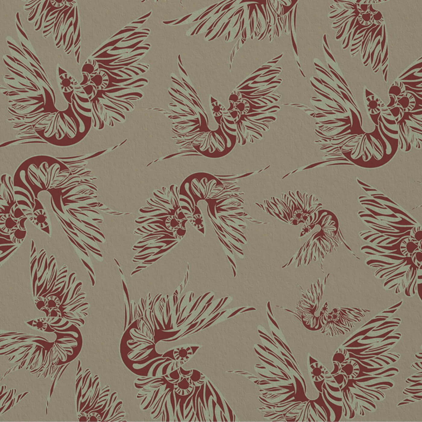 The swallows, drawn in dark Siena Red linework, appear engraved into the surface.