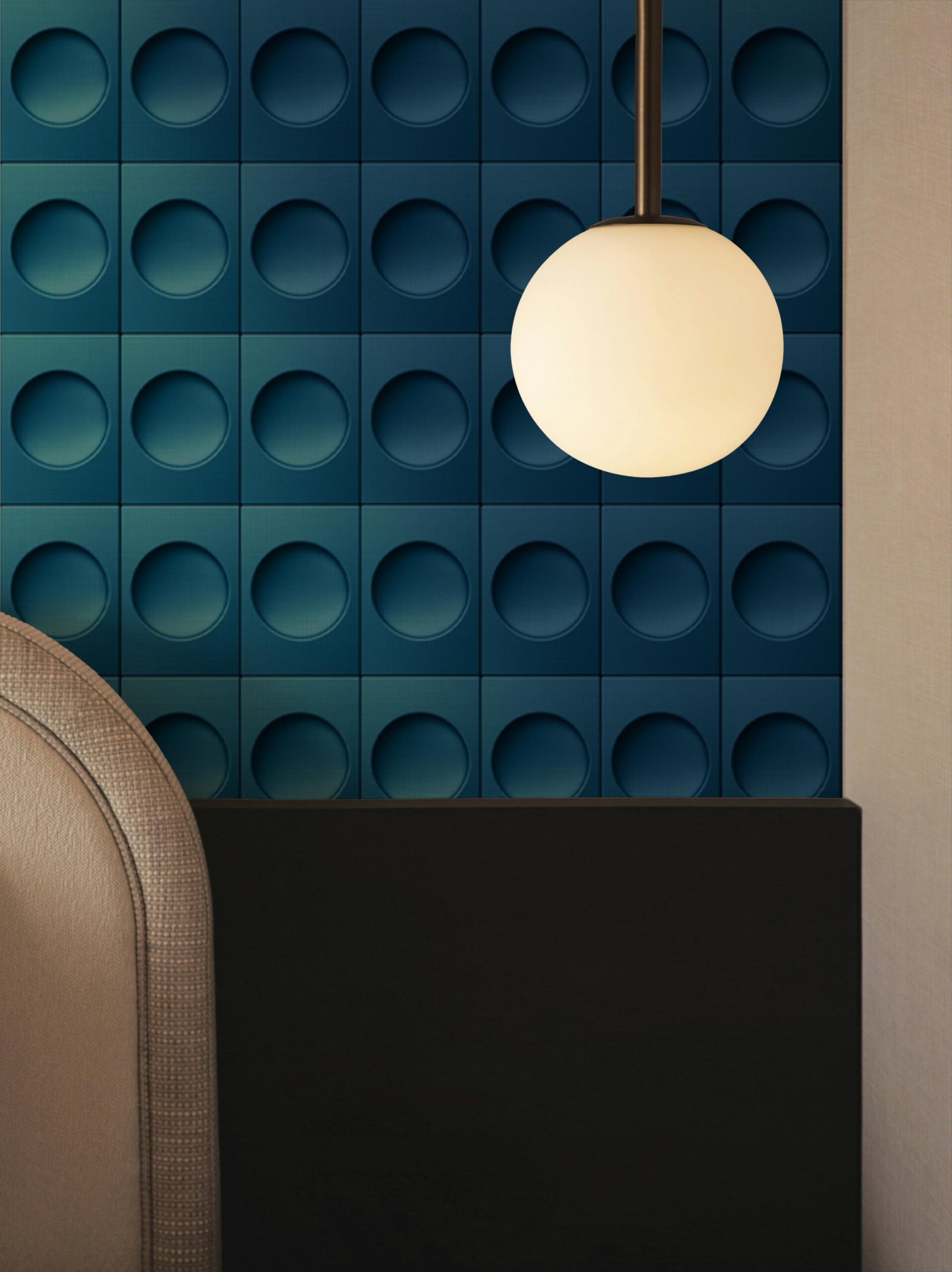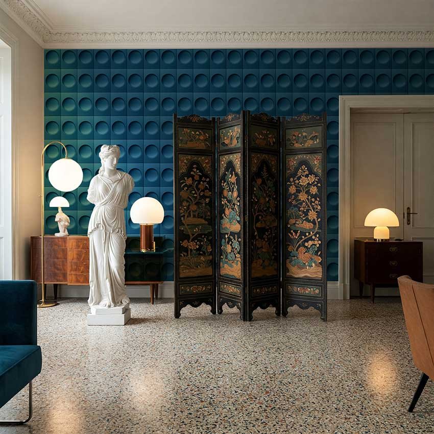 Its simulated three-dimensionality, achieved through meticulous digital lighting and textural rendering, makes Rosetta – Blu Mediceo a visually tactile mural composition — not merely a background, but a structural, spatial vibration.
