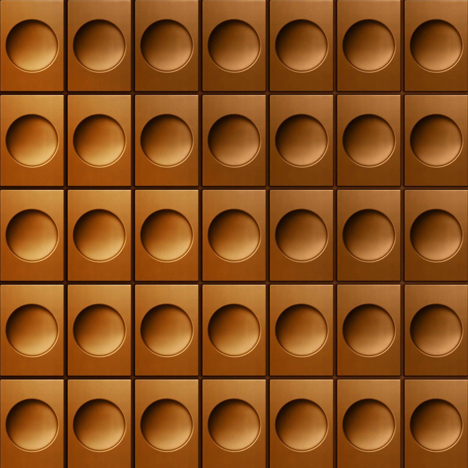 The composition is structured on a precise geometric grid: rectangular modules with concave ellipses at their center create a rhythm of solids and voids, recalling the language of architectural bas-relief and woodcarving.