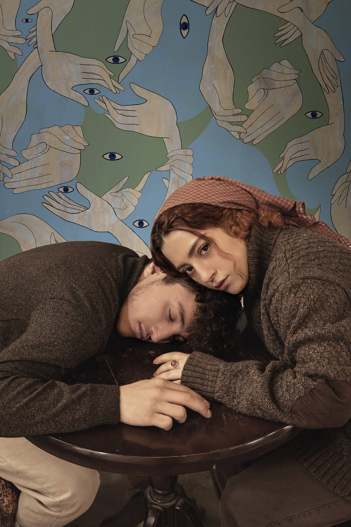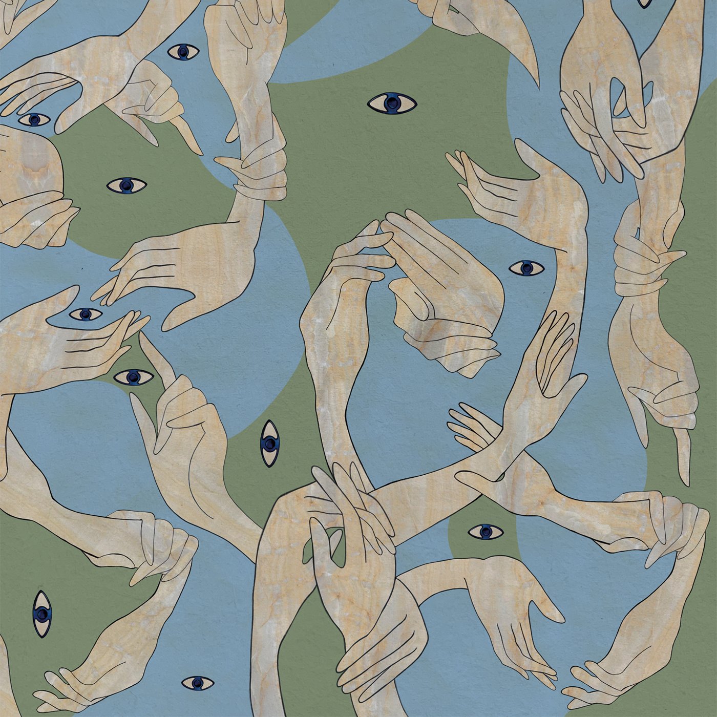 In this version of Uno, Nessuno, the background doubles into a visual camouflage of powder blue and sage green — two soft, desaturated, and deeply tactile tones. The beige onyx hands, light and graphic, move naturally across this base, emerging and fading with the light. Blue eyes, discreetly scattered, disrupt order and create silent tension.