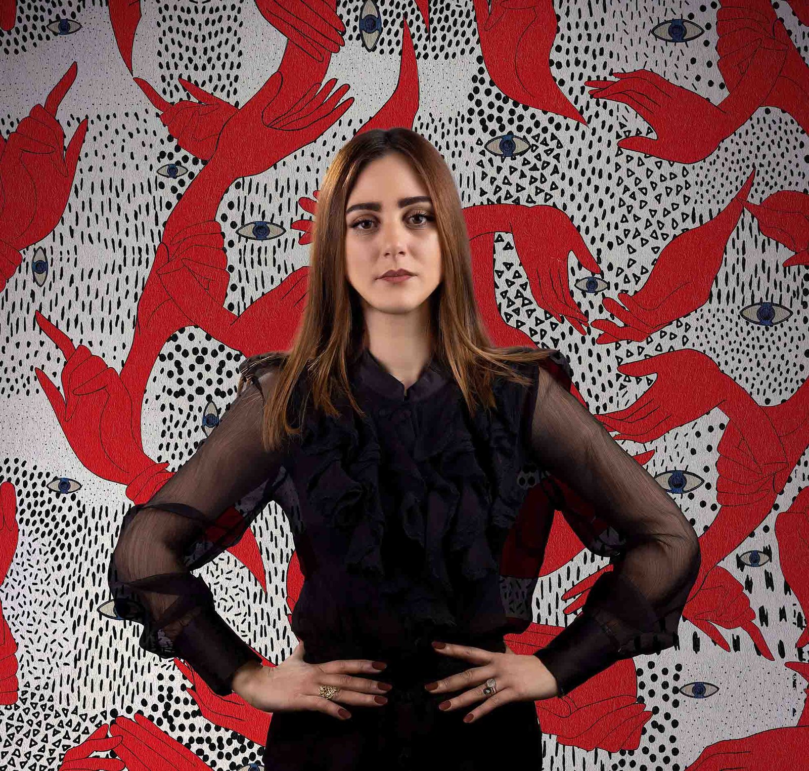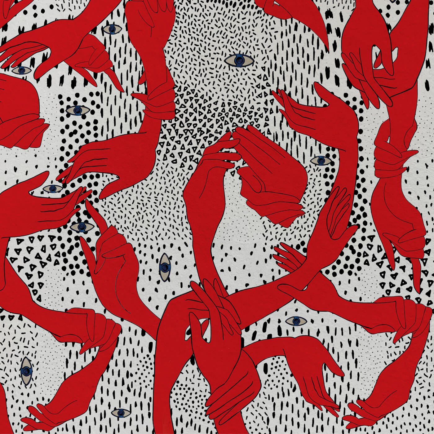 The design develops on a fluid grid, where stylized hands intertwine and small blue eyes interrupt the harmony, creating visual tension. Each element is drawn with a bold black line, yet the subtle variations between gestures amplify its narrative power.