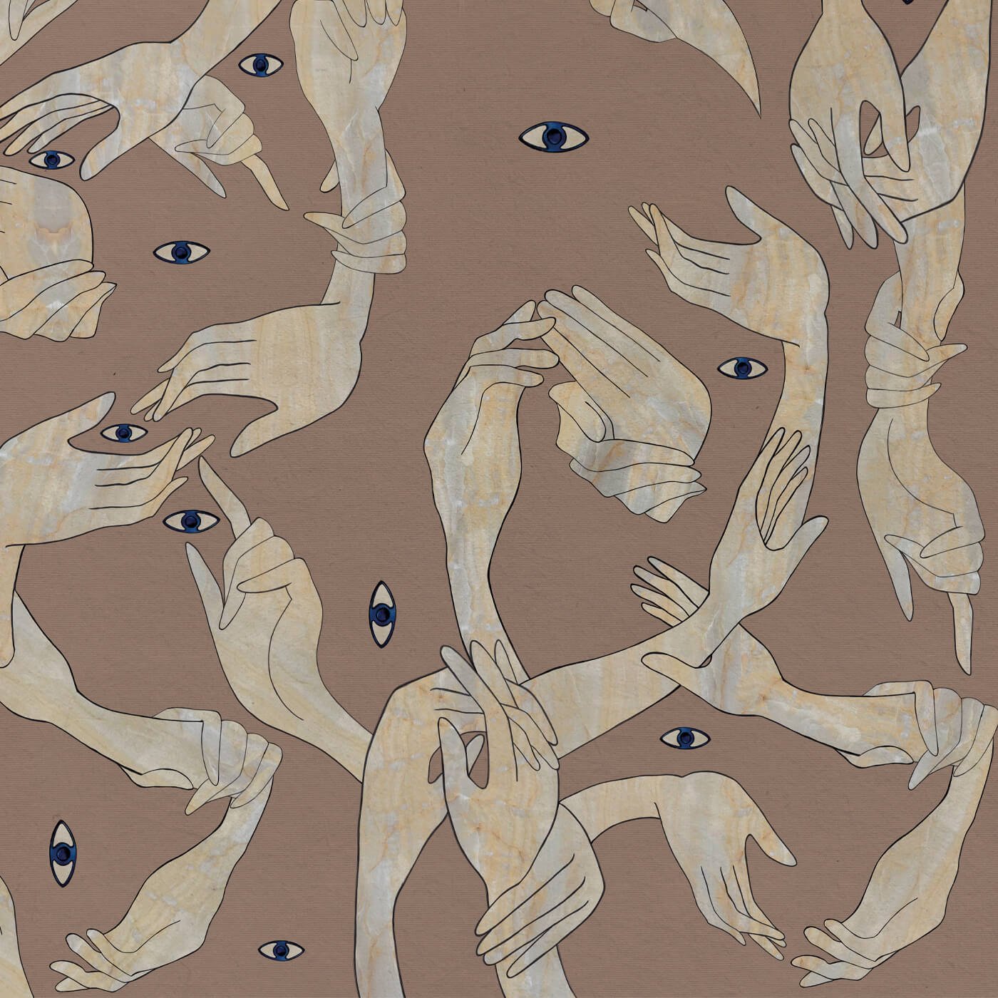 This composition is built on a repeating visual alphabet — hands that touch, stretch, and elude one another. The eyes, recurring icons, disrupt the flow to create poetic tension and symbolic awareness. Every line is drawn with a precise black stroke, every detail carefully balanced to evoke memory, intimacy, and perception.