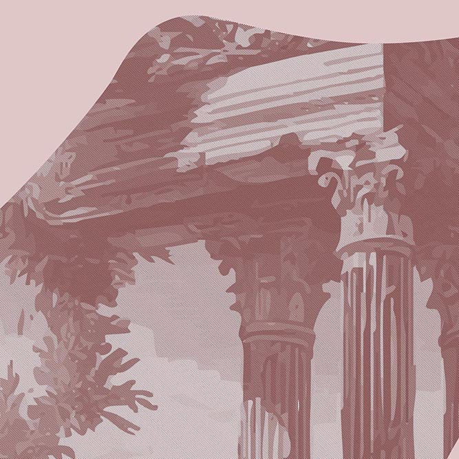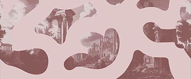 The Roman ruins, reinterpreted in grey scale, appear silent and poetic, while the graphic structure dissolves into the texture, accompanied by abstract forms and floating lines that hover between dream and matter.