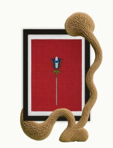 Lo sfondo rosso, caratterizzato da una texture vellutata, avvolge il soggetto in una presenza intensa e materica, mentre il passepartout bianco grafico incornicia l’immagine con eleganza misurata, enfatizzandone la verticalità e la purezza delle linee.