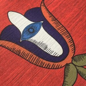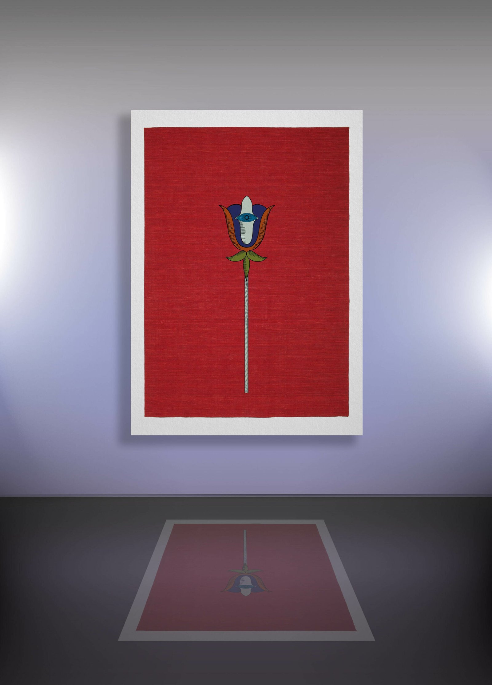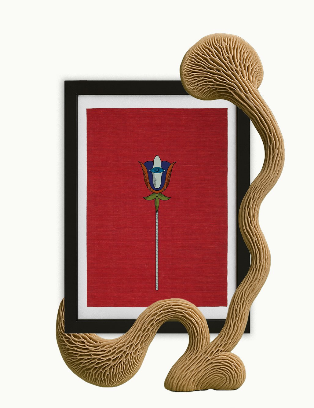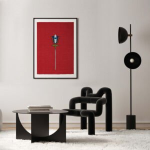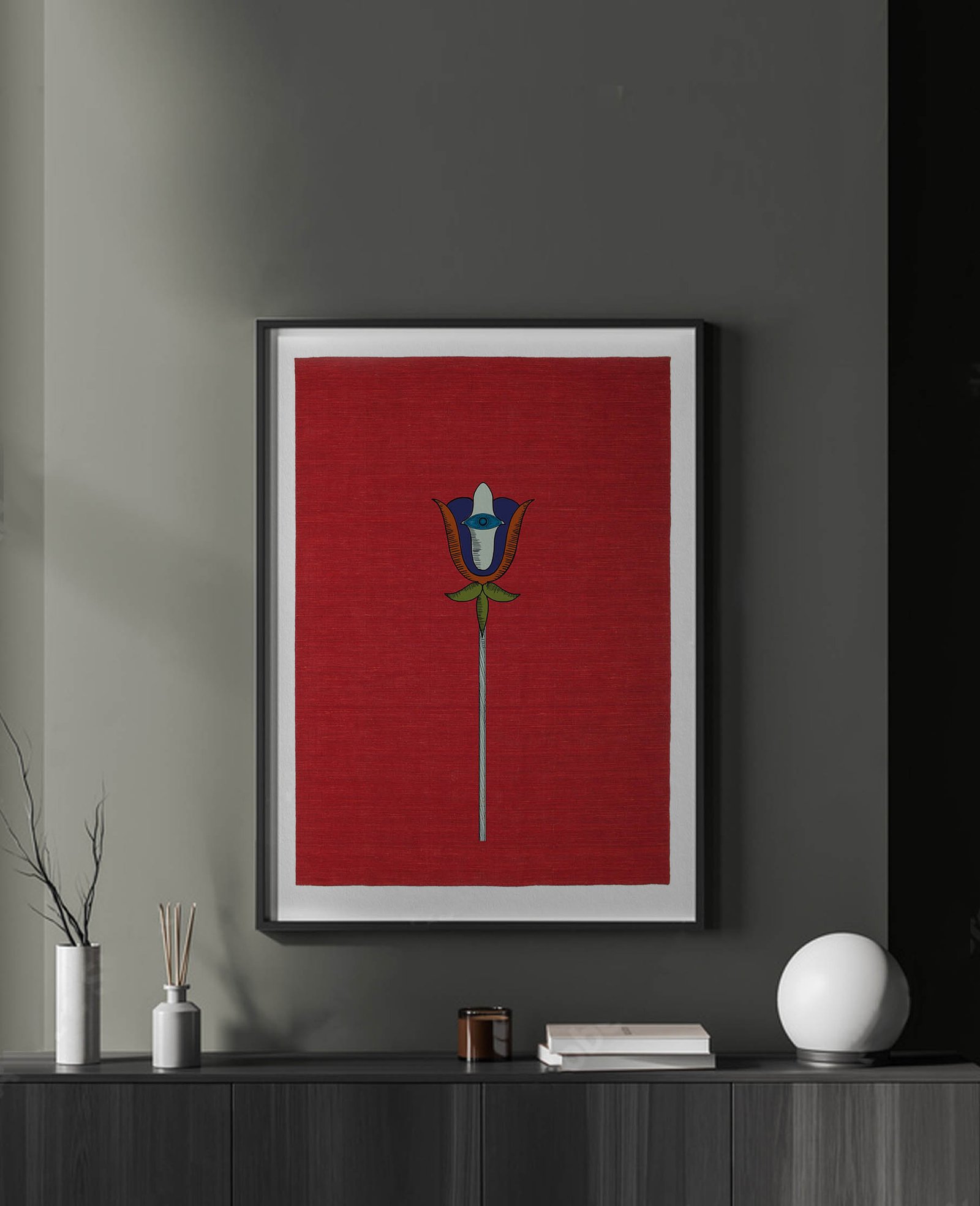 “Fiore” è una stampa d’arredo che nasce da uno degli elementi decorativi della carta da parati “Via Salvestrina,12”. Qui il soggetto viene isolato e trasformato in un’icona grafica: un fiore astratto, stilizzato con linee nette e colori pieni, in cui la forma vegetale si fonde con un linguaggio simbolico e quasi totemico.