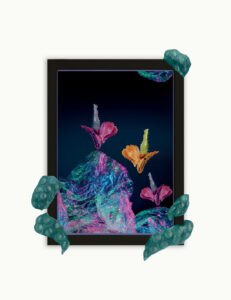 Questa “enciclopedia di immagini” viene sovrapposta, distorta e ricomposta attraverso layers digitali in Photoshop, generando un paesaggio fluido dove la figura della medusa perde i suoi contorni reali e si trasforma in una creatura luminosa, ibrida, quasi minerale. Le forme fluttuano sopra superfici iridescenti che ricordano plastica, acqua o cristalli, in un continuo gioco di metamorfosi visiva.