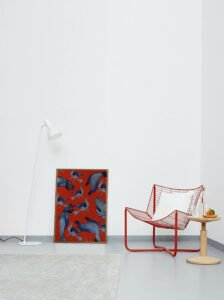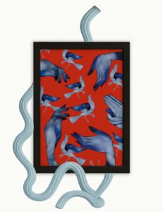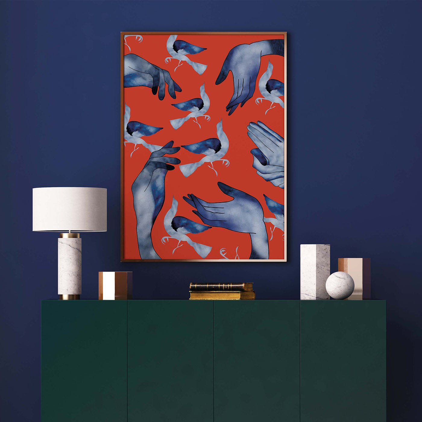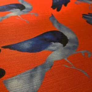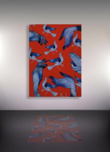 Sul fondo, un rosso pieno e vibrante crea una tensione cromatica intensa, contro cui si muovono le silhouette dei volatili: presenze leggere, quasi meteorologiche, che attraversano la composizione come piccole nuvole in volo. L’insieme diventa così un ritmo visivo fatto di gesti, aria e movimento.