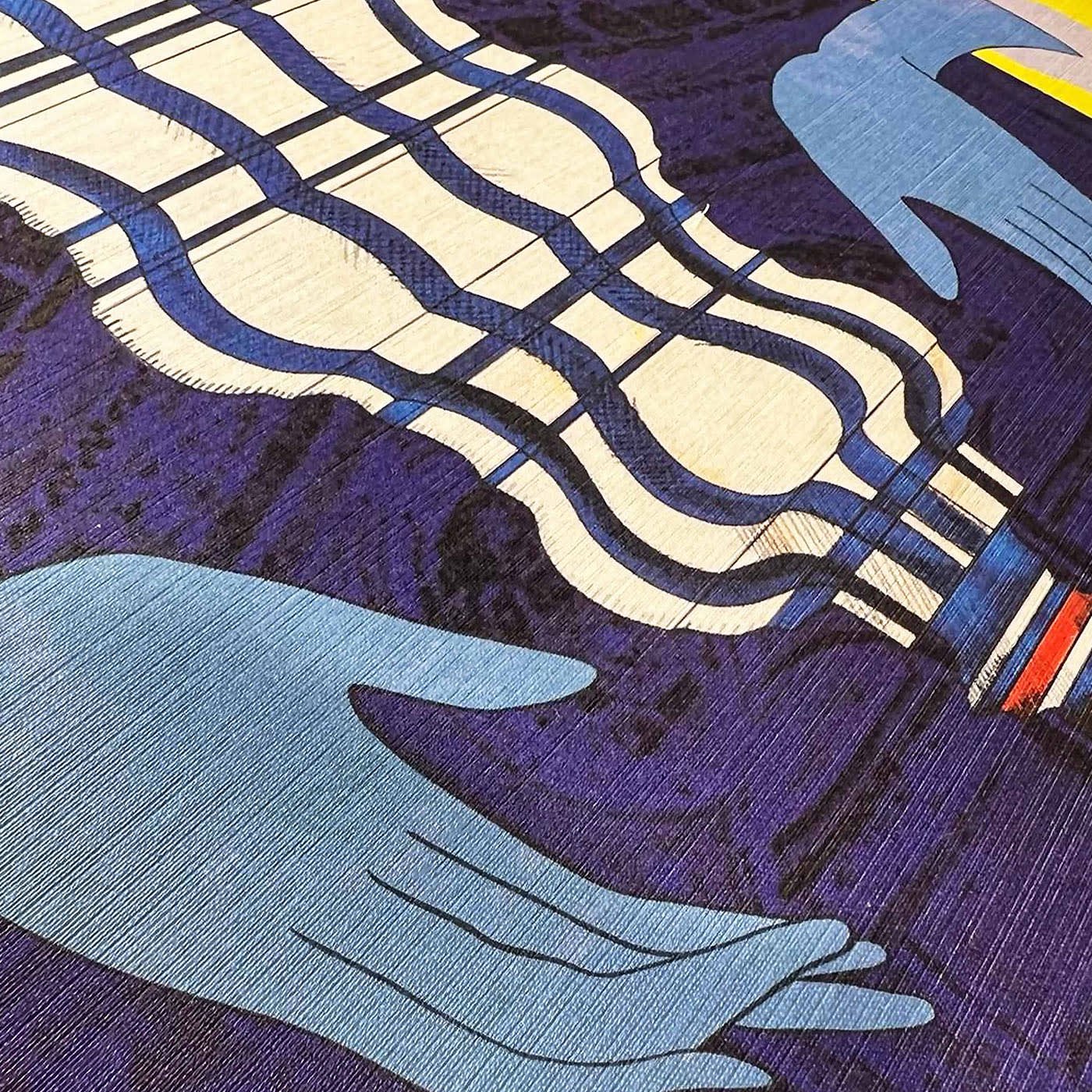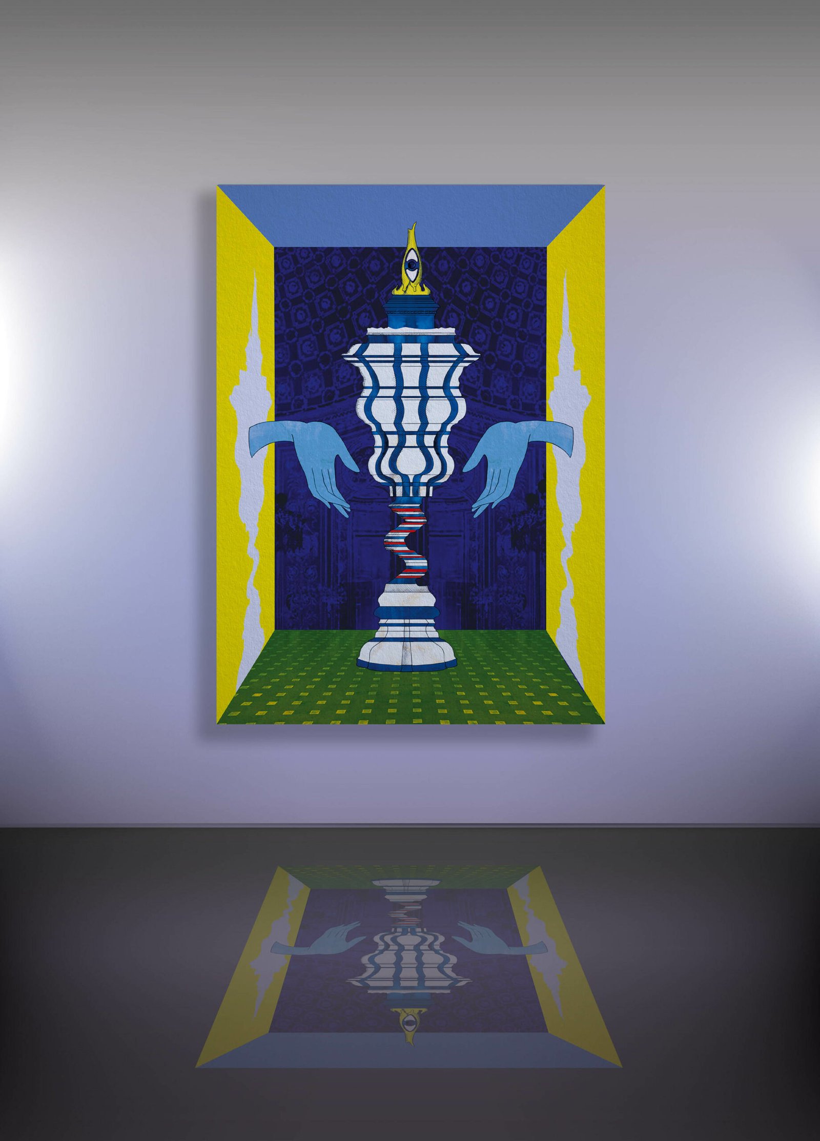 Ad accentuare questa tensione visiva, due mani emergono dalle pareti laterali: un gesto simbolico, sospeso tra protezione e miracolo meccanico, che incornicia l’oggetto e sembra salvarlo dalla caduta imminente. Il fondale, ricco di texture e contrasti cromatici, amplifica il carattere teatrale dell’opera.