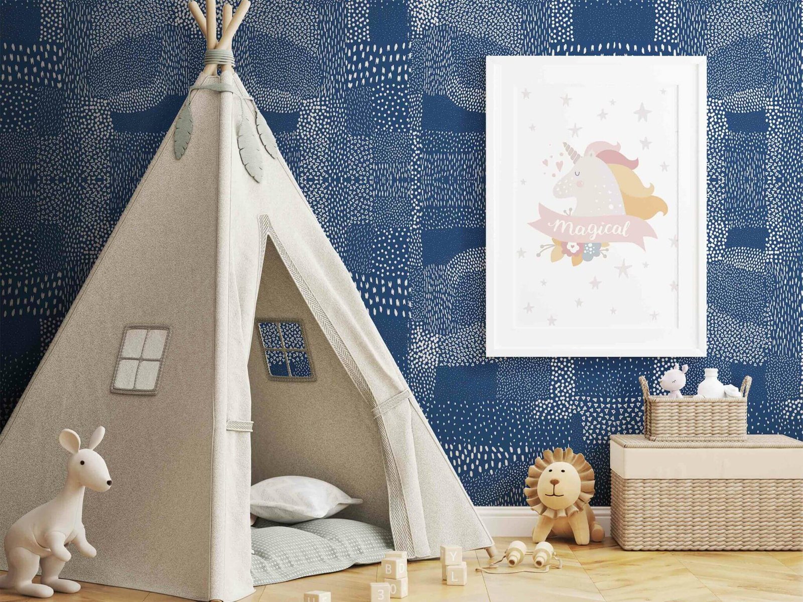 Il fondo in blu profondo, denso e saturo, stabilisce la base emotiva su cui si muovono macchiette bianche stilizzate. Queste ultime, volutamente imprecise, disegnano un pattern astratto dal ritmo visivo fluido, apparentemente casuale ma attentamente calibrato. Il risultato è un insieme che cattura lo sguardo e stimola la percezione, perfetto per chi cerca una decorazione murale sensoriale, giocosa e contemporanea.