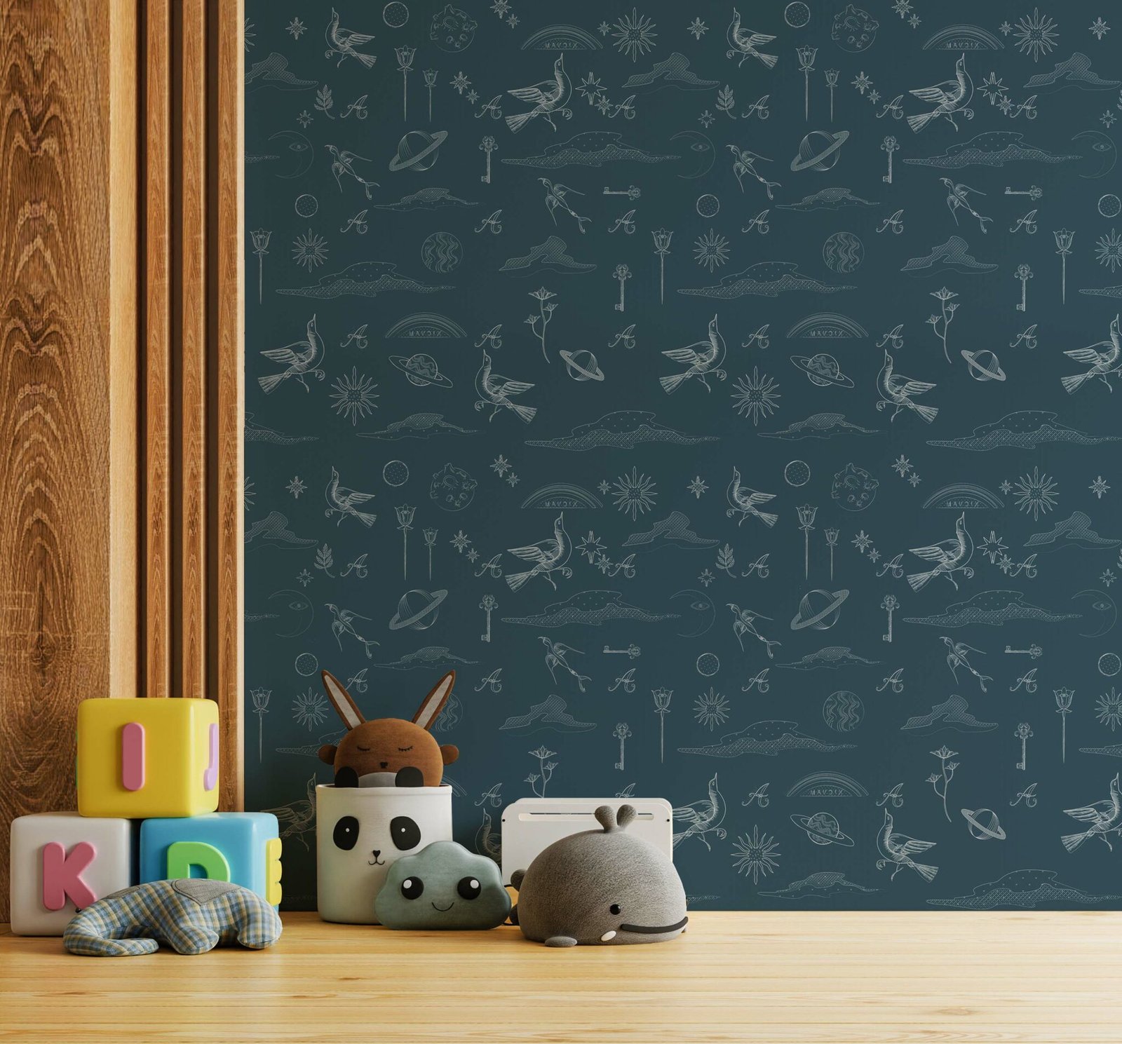 Universo Abete, firmata da Marika Tardio per MaVoix, è una carta da parati pensata per raccontare storie silenziose e immaginifiche attraverso un pattern poetico e sospeso. Elementi archetipici si rincorrono su uno sfondo profondo: volatili dalle piume leggere, chiavi perdute, lune con l’iride, fiori totemici, stelle erranti, arcobaleni scritti, nuvole che sembrano pensieri.