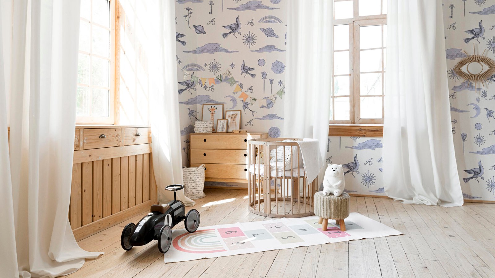 Il design Universo Lilla Delicato è personalizzabile: le lettere visibili nel disegno (una “A” simbolica) possono essere modificate con l’iniziale del nome del bambino, o con un carattere significativo per te. Un dettaglio poetico, delicatamente inserito, che rende ogni parete veramente unica.