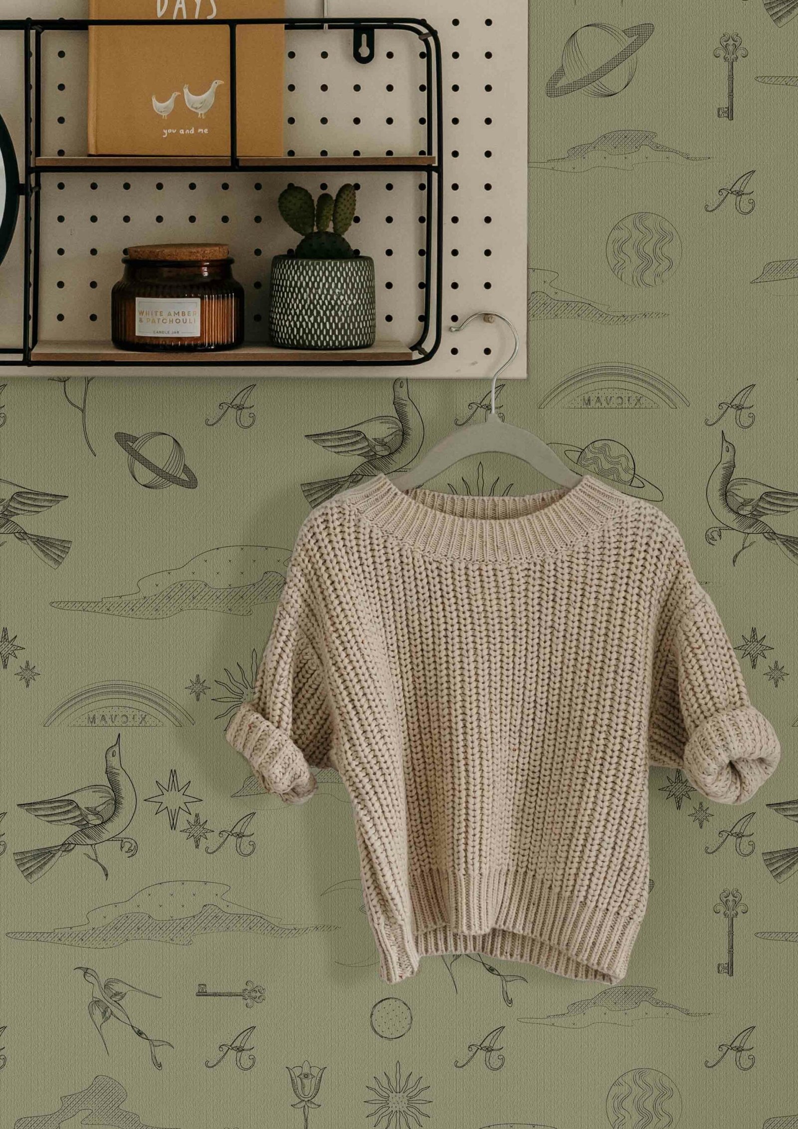 Universo Salvia è una carta da parati illustrata da Marika Tardio per MaVoix che trasforma la parete in un campo visivo aperto, delicato e narrativo. Un pattern illustrato a mano dove ogni elemento è sospeso come in orbita: volatili mitologici, chiavi antiche, lune dalle palpebre chiuse, fiori che osservano, nuvole sottili, stelle erranti.